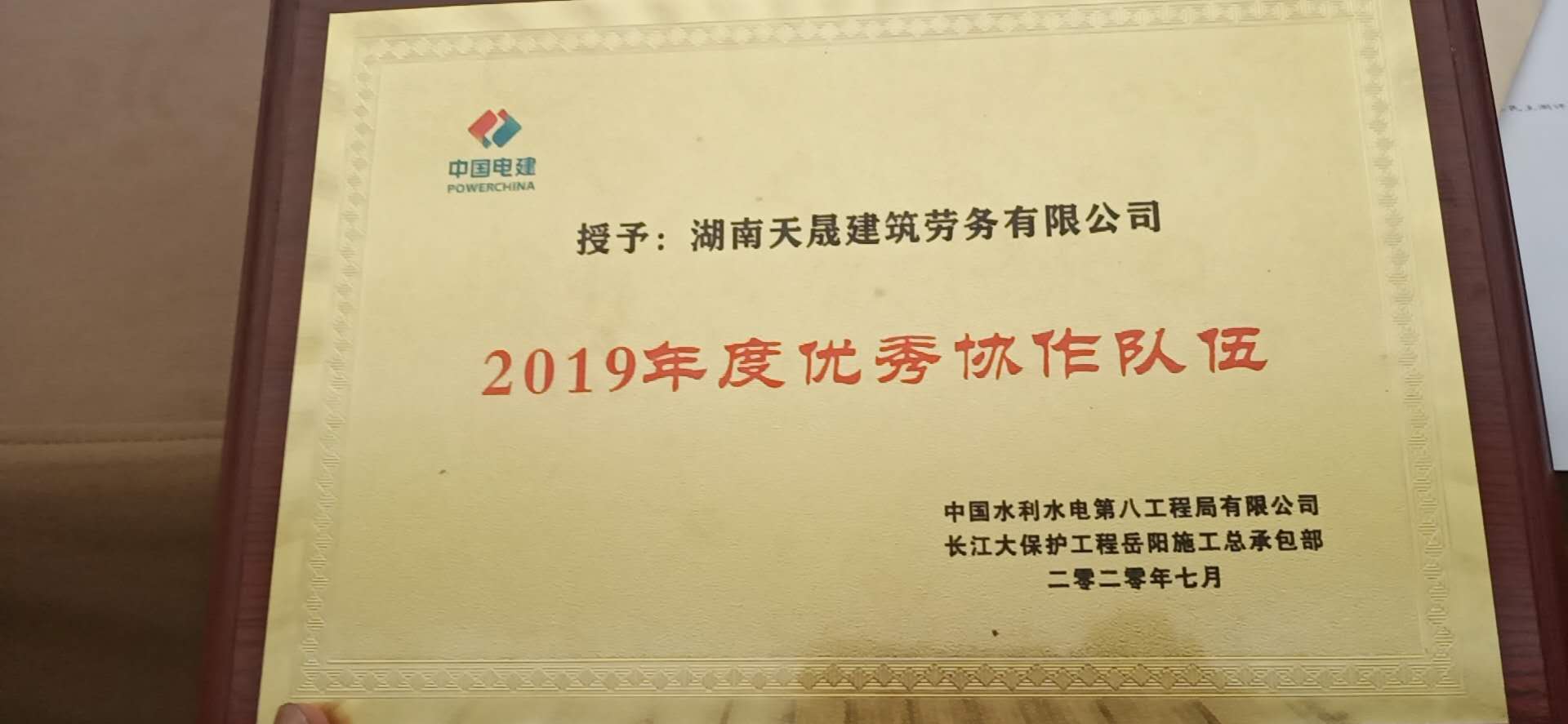 2020年7月公司榮獲中國水利水電第八工程局有限公司——長江大保護(hù)工程岳陽施工總承包部2019年度優(yōu)秀協(xié)作隊(duì)伍